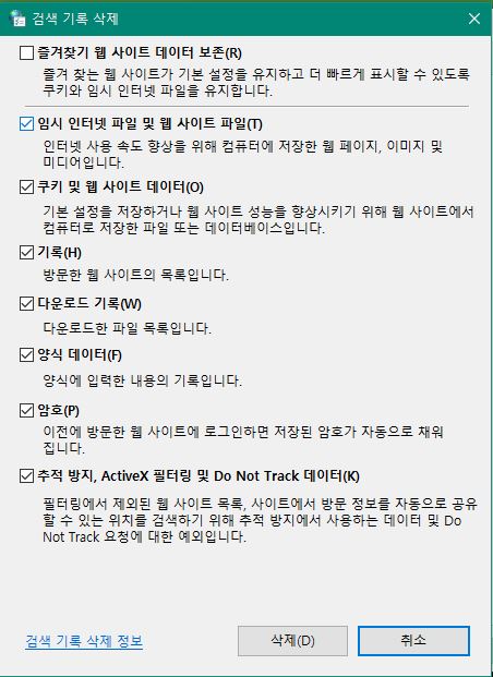 7.일반-검색 기록-삭제-즐겨찾기 웹 사이트 데이터 보존 체크제외하고 나머지 다 체그(즐겨찾기 웹 사이트 데이터 보존 체크 해제)-삭제-확인