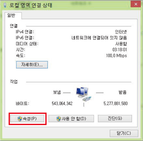 2.로컬 영역 연결 상태 창이 열리는데 거기에 속성을 누릅니다.