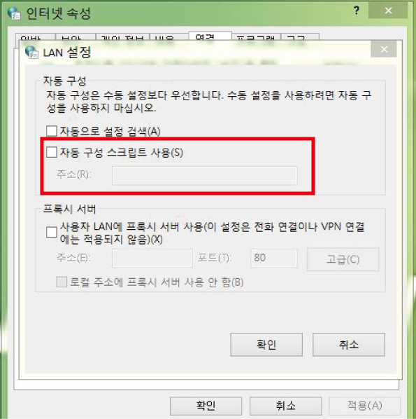 위치 : 제어판-인터넷 옵션-연결-LAN 설정
