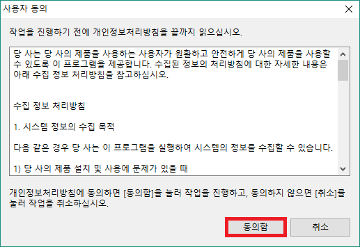 4) 아래와 같이 사용자 동의 창이 표시되면 [동의함]을 눌러주십시오.