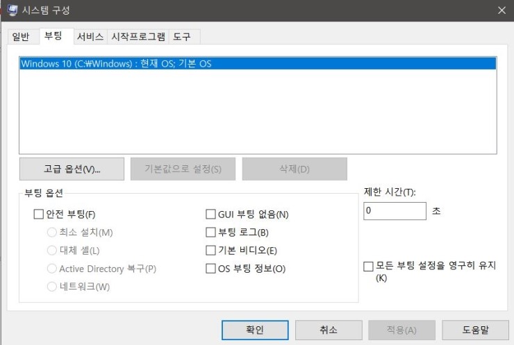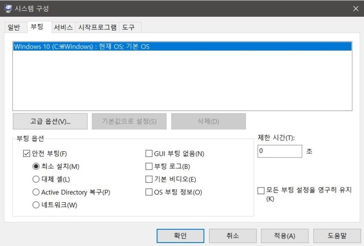 참고 안전 부팅 체크되어있으면 체크해제하기전까지는 계속 안전모드 진입하게 됩니다.