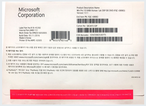정품 패키지 또한, 위조 품의 경우 마감이 좋지 않으며, 윈도우 로고 또한 마감이 불량합니다.