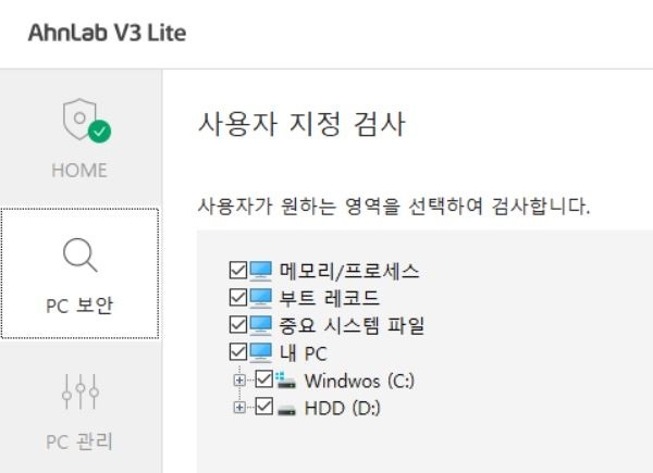 작성자 권고사항이 있지만 V3 Lite 제품 설치후 메인화면에 PC보안-사용자 지정 검사쪽 가면 메모리/프로세스, 부트 레코드, 중요 시스템 파일, 내 PC가 나와있지만 거기 전부다 체크후 한번 검사진행하는게 권장함 다음에 정밀검사시 빠르게 검사 끝날수 있음