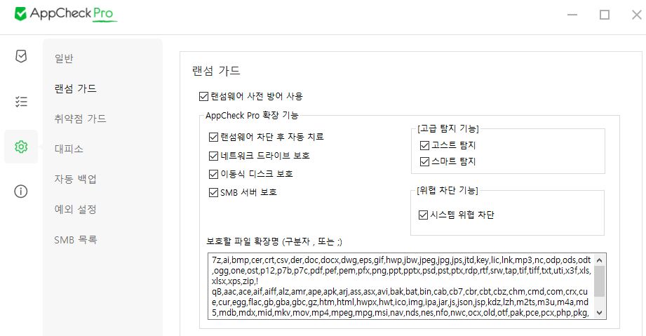보호할 파일 확장명쪽 보호할 확장명이 없으면 직접 추가가능합니다