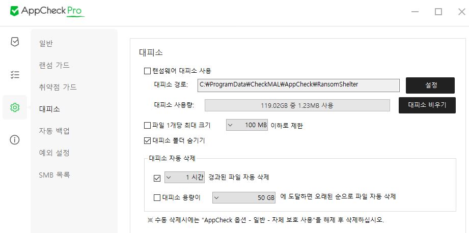 대피소 용량경우 설정한 용량이 되면 오래된 파일이 자동으로 삭제됩니다.