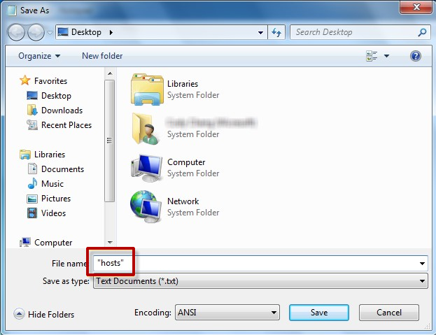 - 선택 다른 이름으로 저장을 파일 메뉴에서 (다음 그림에 표시 됨)에 따라 파일 이름 상자에 "호스트"를 입력 하 고 파일을 바탕 화면에 저장 합니다.
