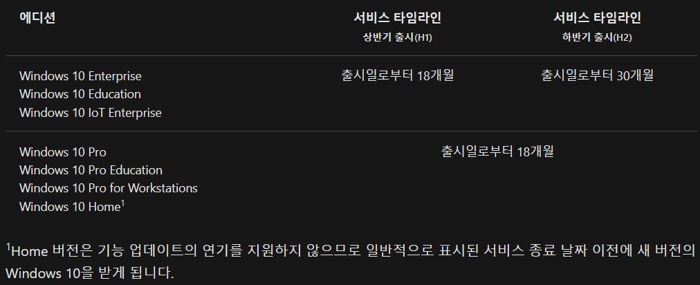 Windows 10 서비스팩 지원기간(Home, Pro, Pro Education, Pro for Workstations)